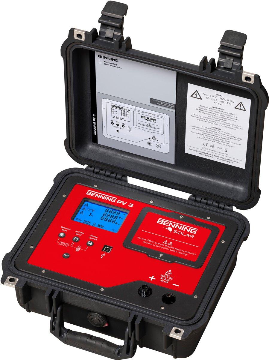 BENNING PV 3. Photovoltaik-Tester. Geeignet für Solarteure zur Erstinbetriebnahme, Wiederholungsprüfung, Fehlersuche, Leistungsbeurteilung, Photovoltaik-Sachverständige sowie Service-, Reinigungs- und Wartungsteams. Prüfung von Solarparks, Kraftwerken und Großanlagen mit 1500 V Technologie. Im Rahmen der Inbetriebnahme- und Wiederholungsprüfung von netzgekoppelten Photovoltaik-Systemen gemäß VDE 0126-23 (DIN EN 62446), können Polaritätsprüfungen, Leerlaufspannungs- und Kurzschlussstrommessungen von parallelgeschalteten PV-Strängen sicher und effizient bis 1500 V/40 A durchgeführt, gespeichert und dokumentiert werden. Einfache Bedienung über Tasten mit AUTO-Prüfablauf. Messwertspeicher für 999 Photovoltaikstränge und USB-Schnittstelle für Messwertdownload im csv-Format. Anzeige graphisch. Hintergrundbeleuchtung der LC-Anzeige ja.