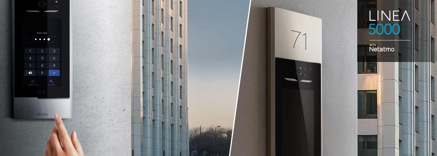 Die Türstation Linea 5000 with Netatmo verwandelt den Gebäudezugang in ein digitales Erlebnis. Mit 5 MPx Weitwinkelkamera, smarten Zutrittsfunktionen und intuitiver Benutzeroberfläche kombiniert sie modernes Design mit Personalisierbarkeit und Spitzenleistung – ideal für Mehrfamilienhäuser.